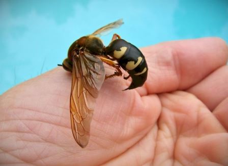 - Цветочные осы наиболее мелкие из всех представителей данных насекомых. Для питания выбирают цветочную пыльцу и нектар. В отличие от бумажных, эти осы предпочитают обосновываться у земляных массивов, а также любят строить свои гнездышки на ветках фруктовых деревьев.